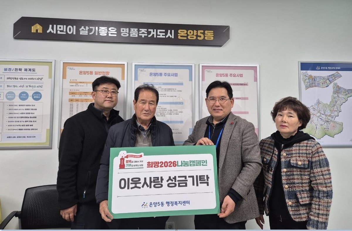 김경일 온양5동장은 “주민 여러분의 따뜻한 마음과 적극적인 참여에 깊이 감사드린다”며 “전해주신 성금은 도움이 필요한 이웃들에게 소중히 전달하겠다”고 감사의 뜻을 전했다.