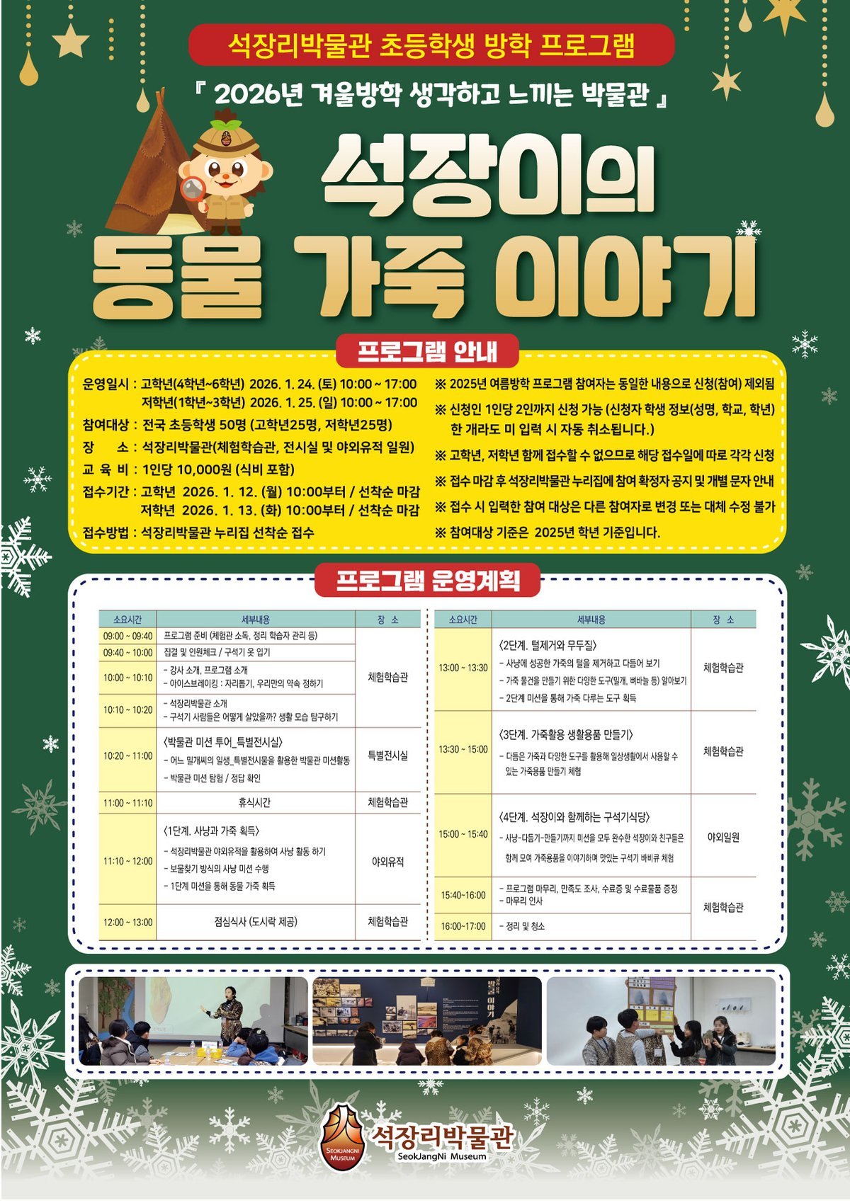이번 프로그램은 공주 석장리박물관에서 ‘석장이의 동물 가죽 이야기’를 주제로 1월 24일과 25일 이틀간 진행되며, 특별기획전 ‘석기이력서_가죽을 다루는 도구들’과 연계해 운영된다.