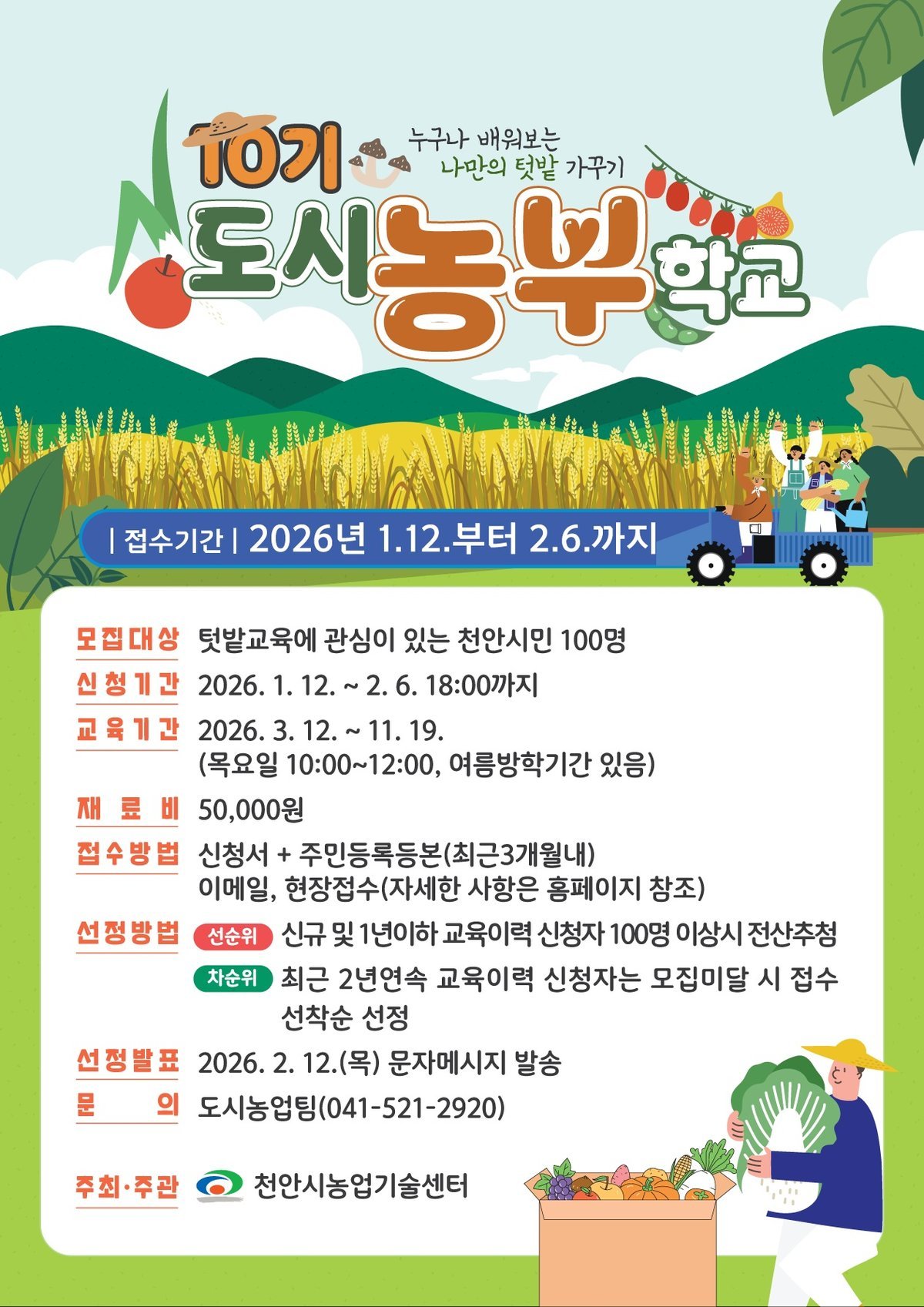 [충청중심뉴스] 천안시농업기술센터는 오는 12일~ 내달 6일 ‘천안도시농부학교 10기 교육생’을 모집한다고 8일 밝혔다.