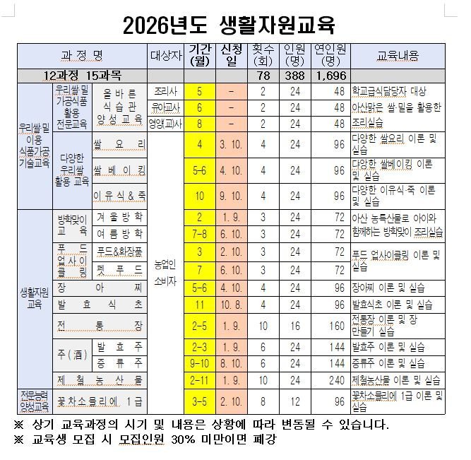 이미용 농촌자원과장은 “올해 생활자원교육은 단순한 실습을 넘어 시민의 삶에 실질적인 도움이 되는 교육이 되도록 계획했다”며, “다양한 교육과정을 통해 많은 시민들이 농촌자원의 가치를 체감하길 바란다”고 말했다.