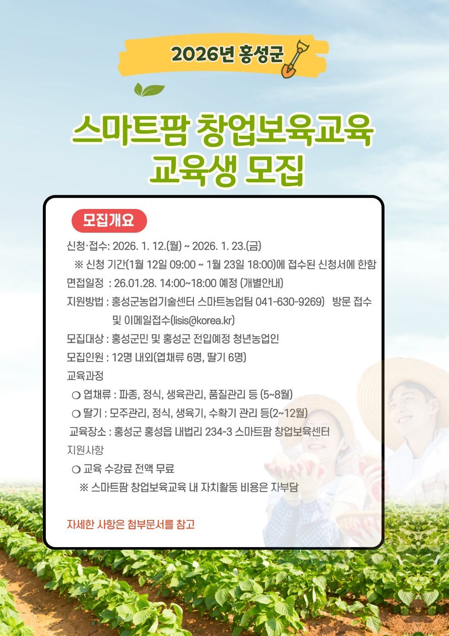 [충청중심뉴스] 홍성군에서는 스마트농업 창업과 확산을 위해 스마트팜 창업보육교육의 교육생을 오는 23일까지 모집한다.