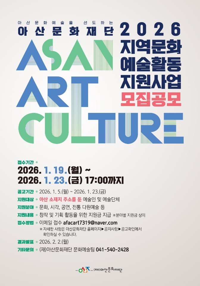 [충청중심뉴스] 아산문화재단은 지역 예술인의 안정적인 창작 환경을 조성하고 문화예술 생태계의 전문성을 강화하기 위해 '2026 지역문화예술 활동지원사업'공모를 시작한다.