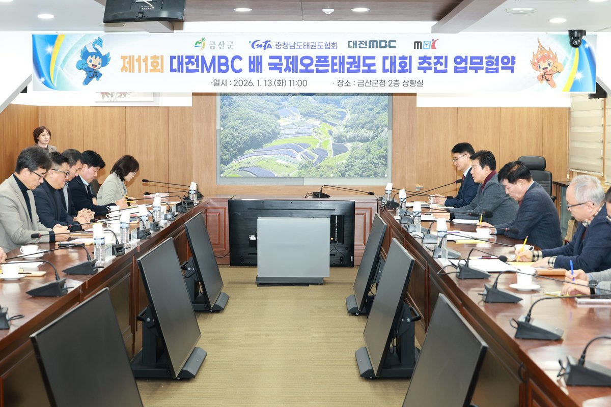 [충청중심뉴스] 금산군은 지난 13일 군청 2층 상황실에서 제11회 대전엠비씨배 국제오픈태권도대회 유치를 위해 대전엠비씨, 충남태권도협회, 엠비씨국제오픈태권도조직위원회와 업무협약을 체결했다.