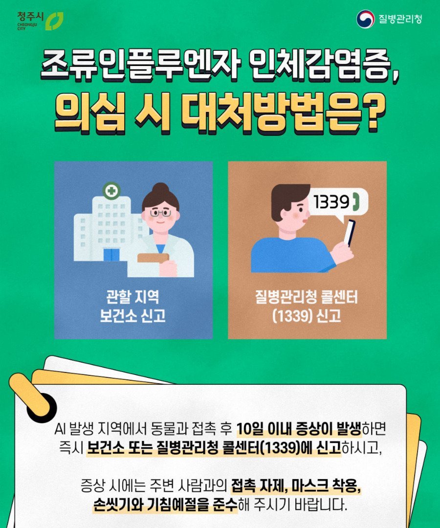 [충청중심뉴스] 청주시 보건소는 16일 최근 충북 지역 가금농가에서 고병원성 조류인플루엔자가 발생함에 따라 시민들에게 AI 인체감염증 예방수칙을 철저히 준수해 줄 것을 당부했다.