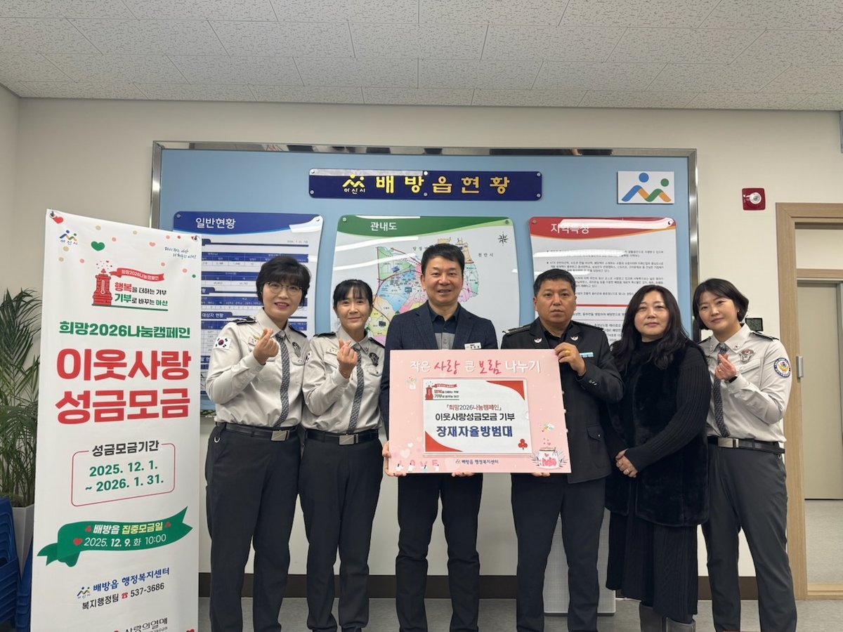강한용 배방읍장은 “평소 지역 치안 활동은 물론 나눔을 실천해 주시는 장재자율방범대에 깊이 감사드린다”며 “기탁된 성금이 꼭 필요한 곳에 전달돼 어려운 이웃들에게 위로와 희망이 될 수 있도록 하겠다”고 밝혔다.