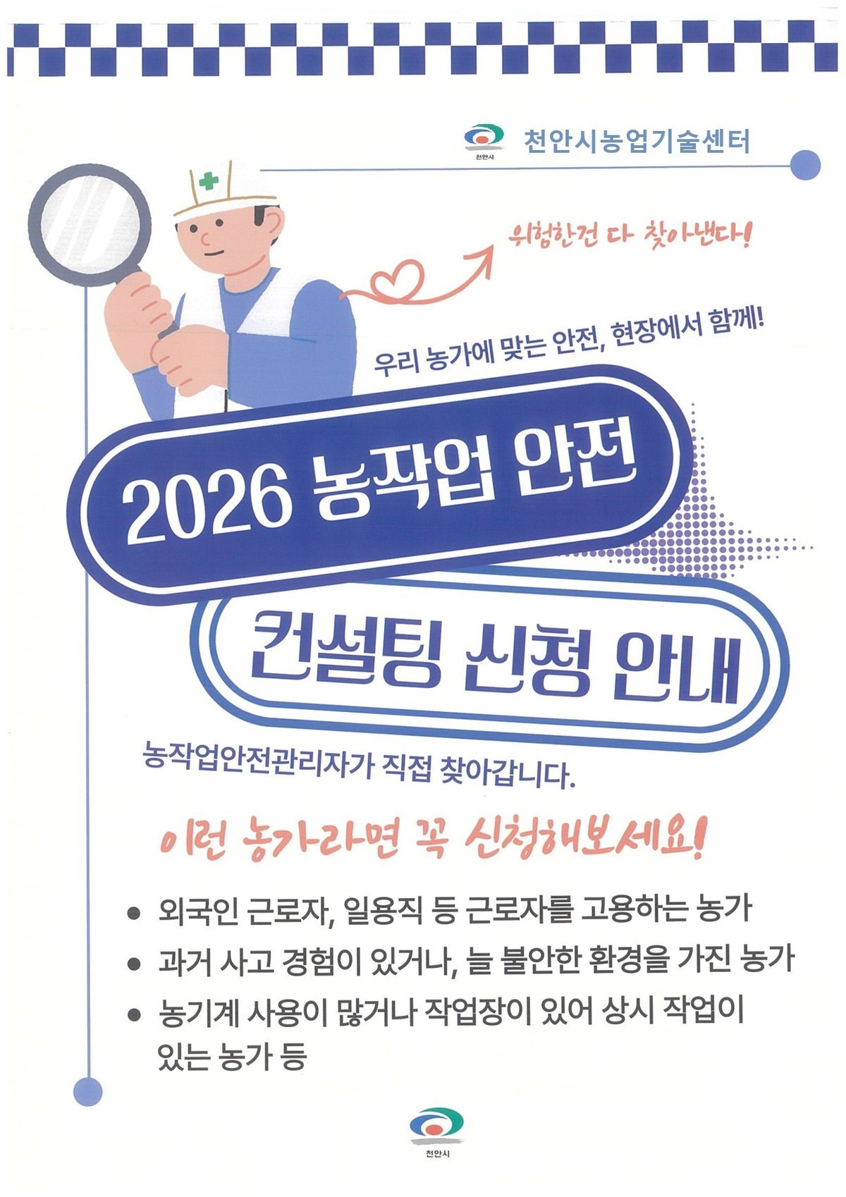 [충청중심뉴스] 천안시농업기술센터는 오는 3월까지 ‘농작업 안전컨설팅’참여 농가를 모집한다고 16일 밝혔다.