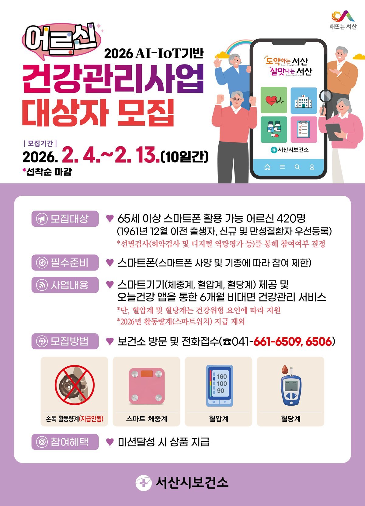 [충청중심뉴스] 충남 서산시가 인공지능·사물인터넷 기반 어르신 건강관리사업의 대상자를 모집한다고 밝혔다.