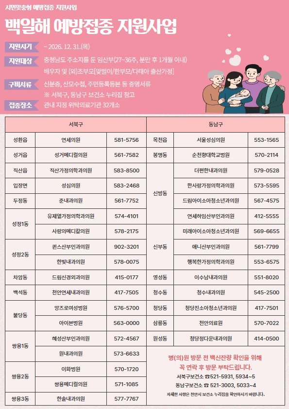 예방접종은 관내 위탁의료기관에서 가능하며 자세한 사항은 천안시 서북구·동남구보건소 누리집에서 확인할 수 있다.