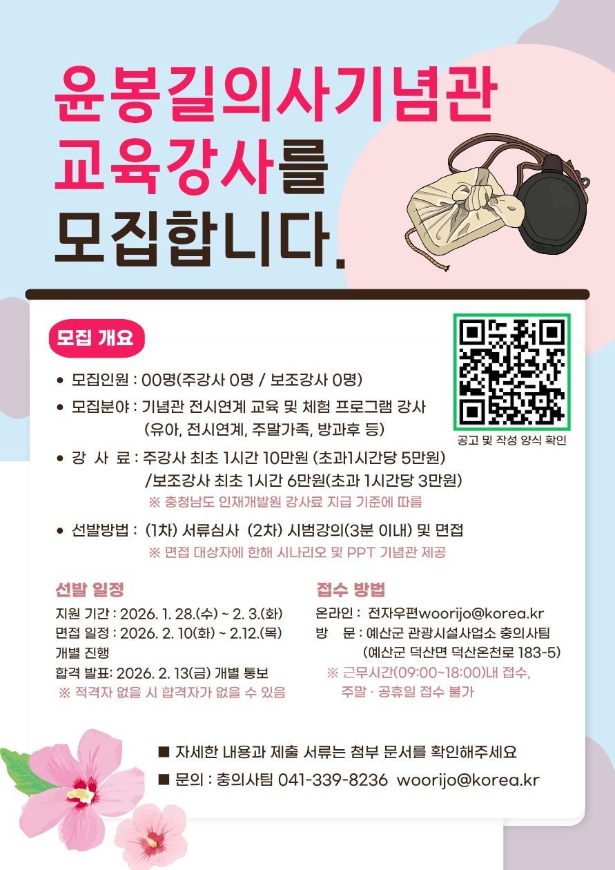 [충청중심뉴스] 예산군 관광시설사업소는 2026년 윤봉길의사기념관 교육 프로그램을 함께 운영할 교육 강사를 공개 모집한다.
