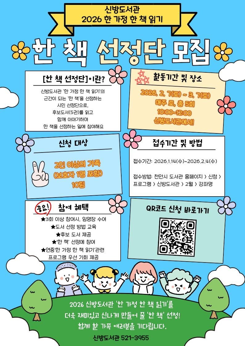 [충청중심뉴스] 천안시 신방도서관은 ‘한 책 선정단’참여 가족을 모집한다고 20일 밝혔다.