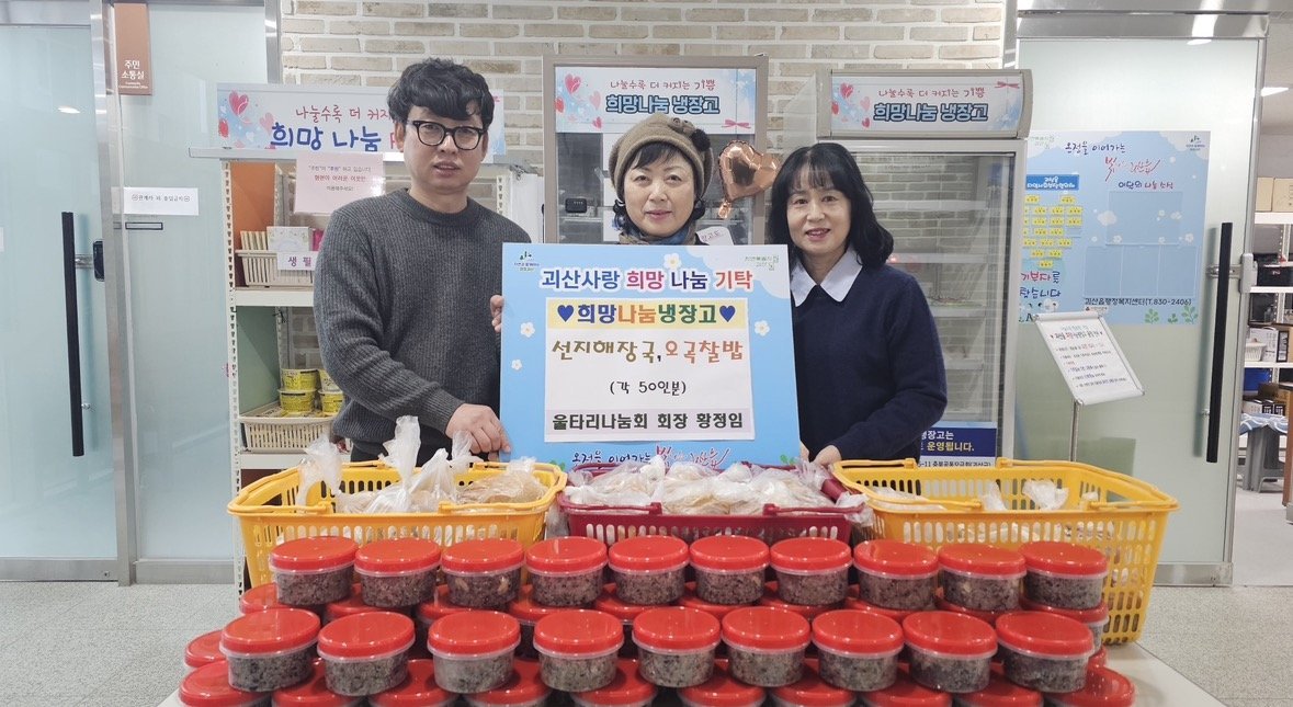 [충청중심뉴스] 충북 괴산군 괴산읍은 울타리나눔회가 20일 괴산읍 행정복지센터를 찾아 저소득층을 위해 사용해 달라며 직접 준비한 선짓국과 오곡찰밥 각 50인분을 기탁했다고 밝혔다.