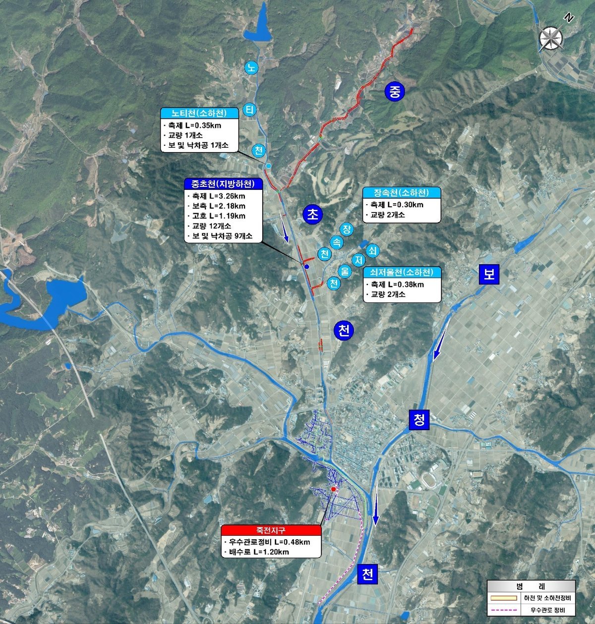 군은 보은읍 중초·장속·노티리 일원을 대상으로 지방하천 정비 6.63km, 소하천 정비 1.03km를 추진하고 장신·죽전리 등 저지대 상습 침수 지역에는 우수관로 개량 1.68km를 병행해 빗물 배수 능력을 대폭 강화할 예정이다.