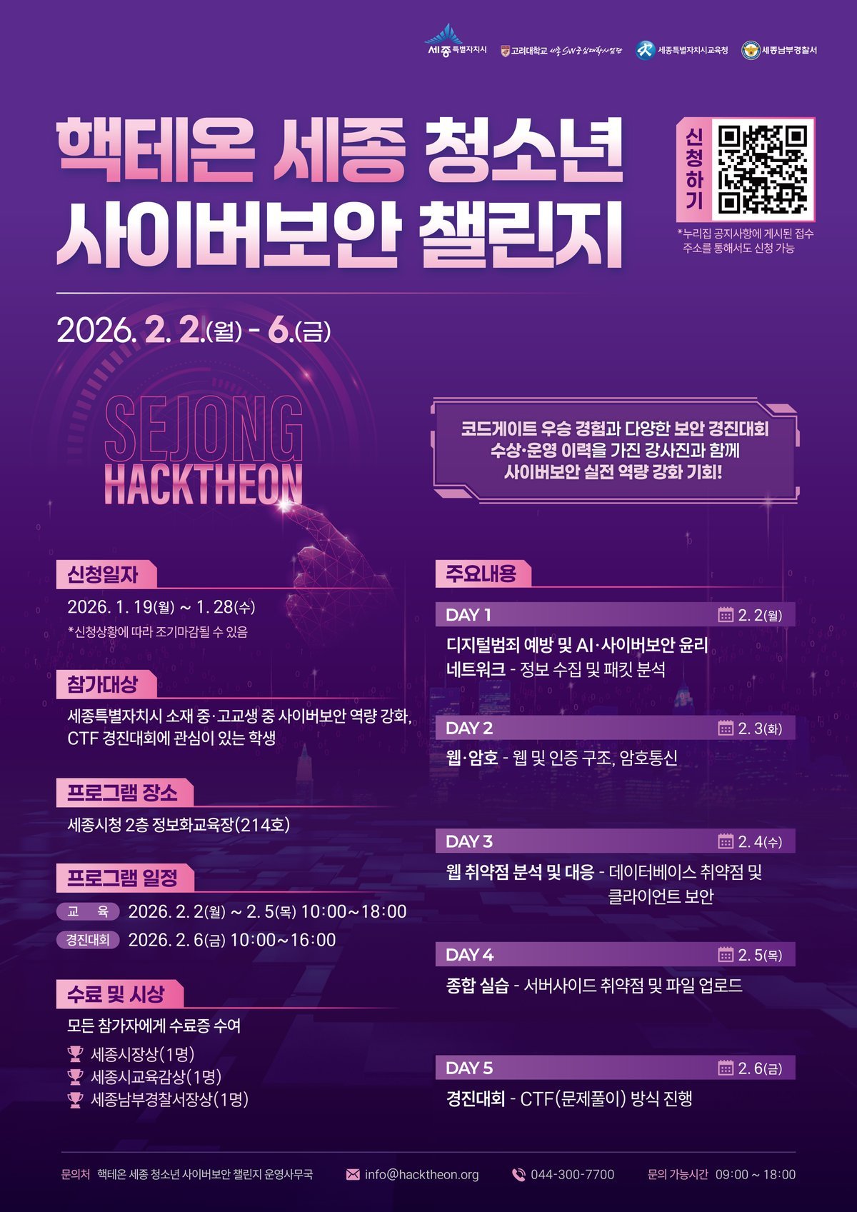 세종시는 오는 28일까지 관내 중고등학생을 대상으로 핵테온 세종 청소년 사이버보안 챌린지 참가자를 모집한다고 밝혔다.