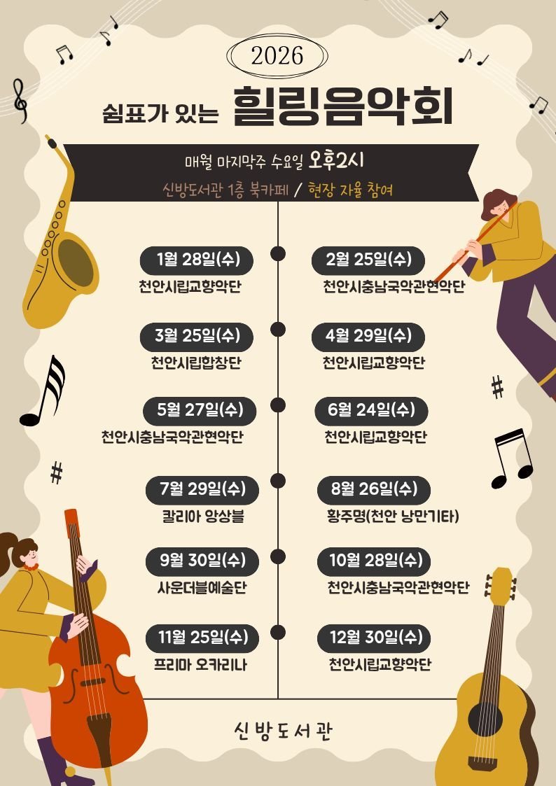 [충청중심뉴스] 천안시 신방도서관은 올해 문화가 있는 날에 ‘ 쉼표가 있는 힐링음악회’를 운영한다고 21일 밝혔다.