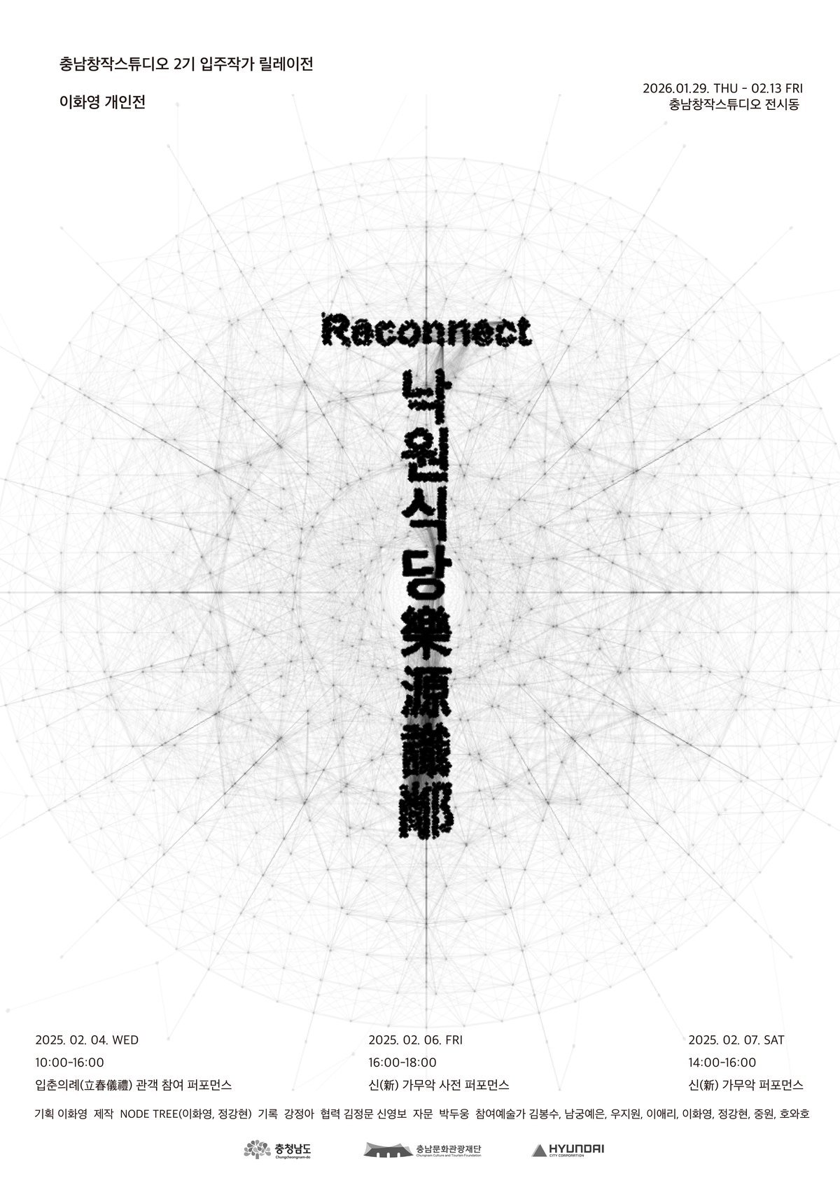 또한 이번 전시는 충남 고유의 문화 자산인 ‘중고제 가무악’을 현대적으로 재해석한 퍼포먼스 〈Moment of Reconnect〉를 운영한다. 2월 6일 오후 4시에는 ‘파형의 유영’을 주제로 한 열린 리허설이 진행되며, 2월 7일 오후 2시에는 서해안 일대에서 수집한 미학적 파편을 엮은 본 공연 ‘신 가무악’이 펼쳐진다. 특히 이번 프로그램에는 승무 분야의 이애리 명인이 협업하여 전통과 현대 예술이 교차하는 새로운 예술적 시도를 선보일 예정이다.