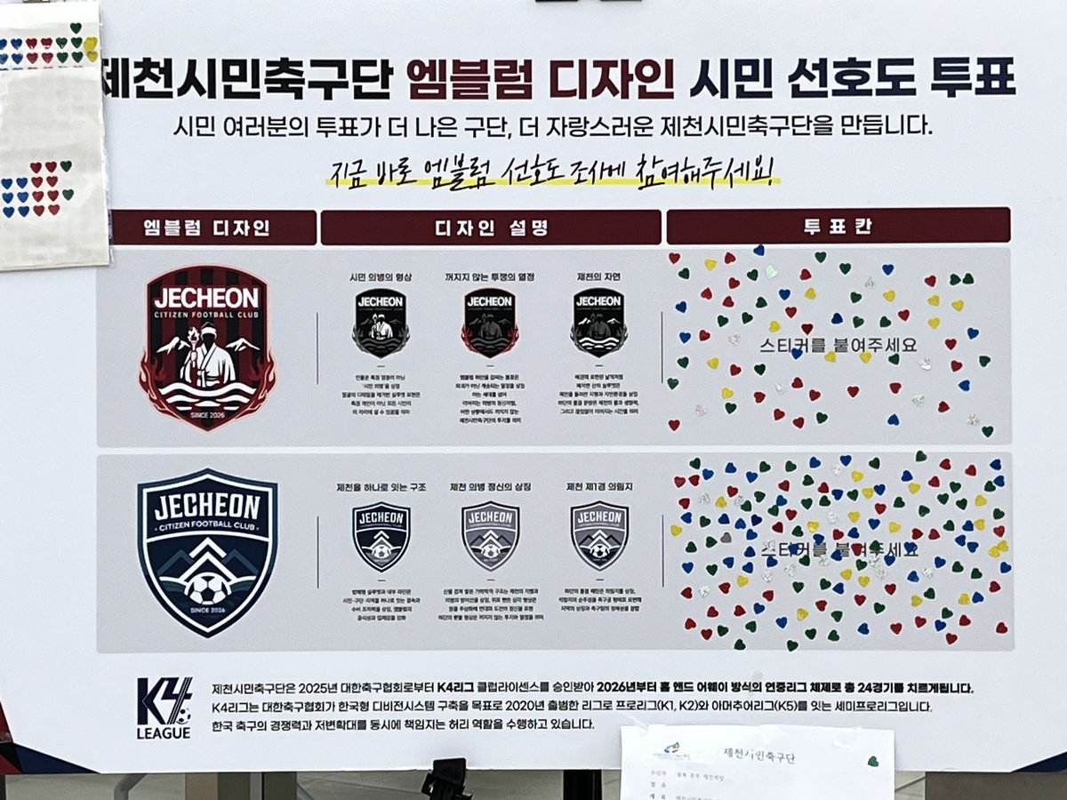 [충청중심뉴스] 제천시민축구단은 구단의 정체성과 가치를 시민과 함께 만들어가기 위해 선정위원회의 심사와 시민 공개투표를 연계한 2단계 절차를 거쳐 공식 엠블럼을 선정했다.