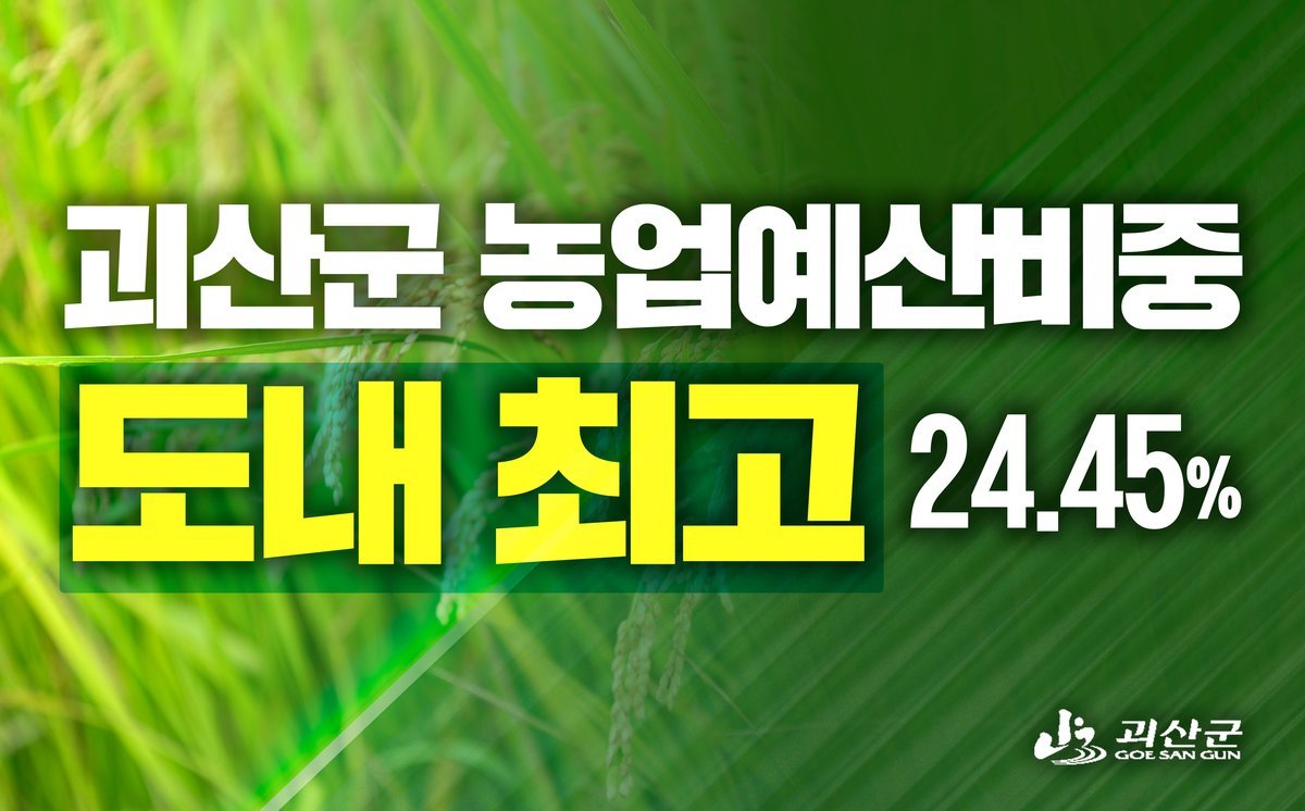 군이 23일 공개한 2026년 시·군별 예산 현황에 따르면 괴산군의 본예산 대비 농업 부문 예산 비율은 24.45%로 충북 11개 시·군 가운데 1위에 올랐다.