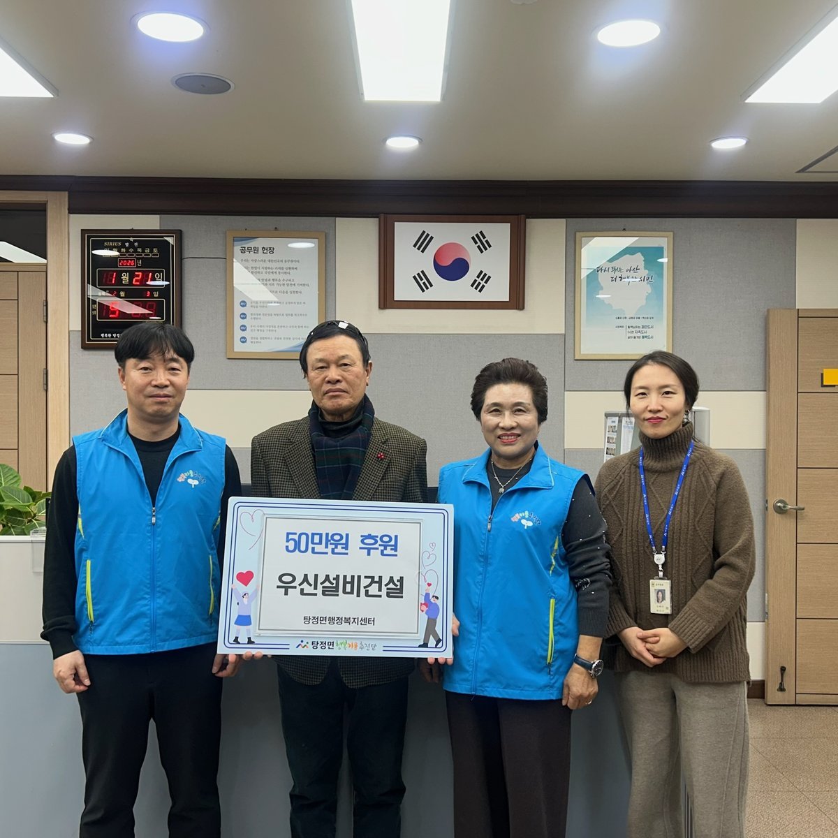 [충청중심뉴스] 우신설비건설㈜은 지난 21일 탕정면 행복키움추진단에 후원금 50만원을 전달했다.
