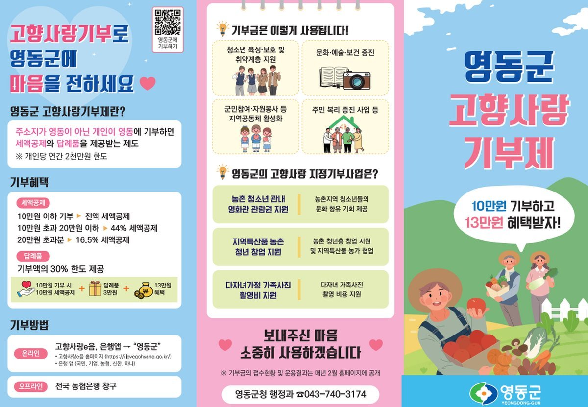 군 관계자는 “앞으로도 군민 삶의 질을 높이는 기금사업과 영동만의 특색 있는 답례품을 지속 발굴해 기부자가 다시 찾는 고향사랑기부제를 만들어가겠다”라고 말했다.