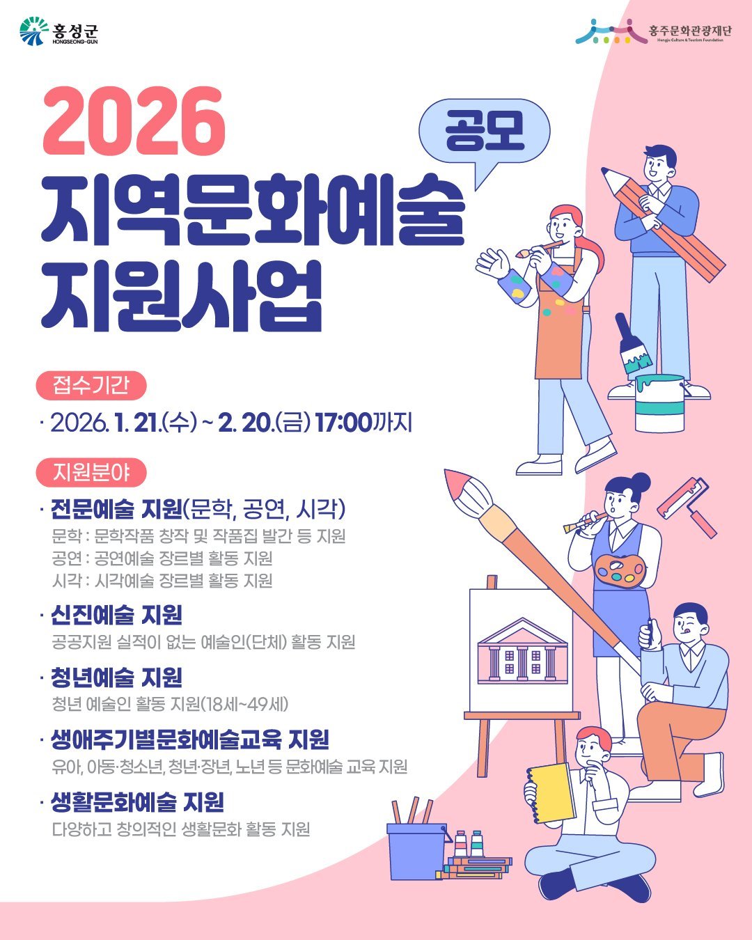 [충청중심뉴스] 홍주문화관광재단은 홍성군 예술인과 예술단체의 창작활동을 활성화하고 군민 문화향유 기회 확대를 위해‘2026년 지역문화예술지원사업’공모를 진행한다.