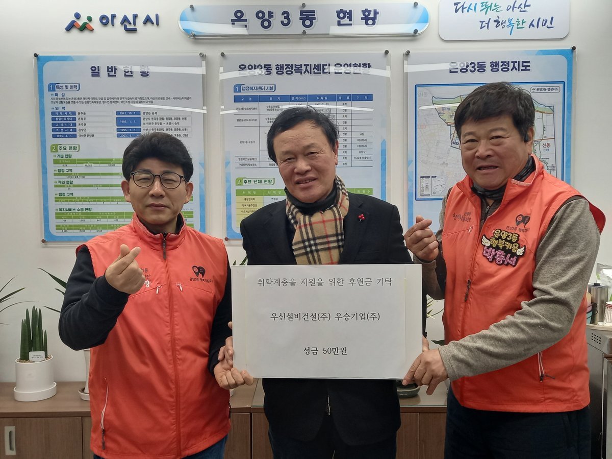 [충청중심뉴스] 우신설비건설㈜은 지난 23일 관내 취약계층 지원을 위해 후원금 50만원을 온양3동 행복키움추진단에 전달했다.
