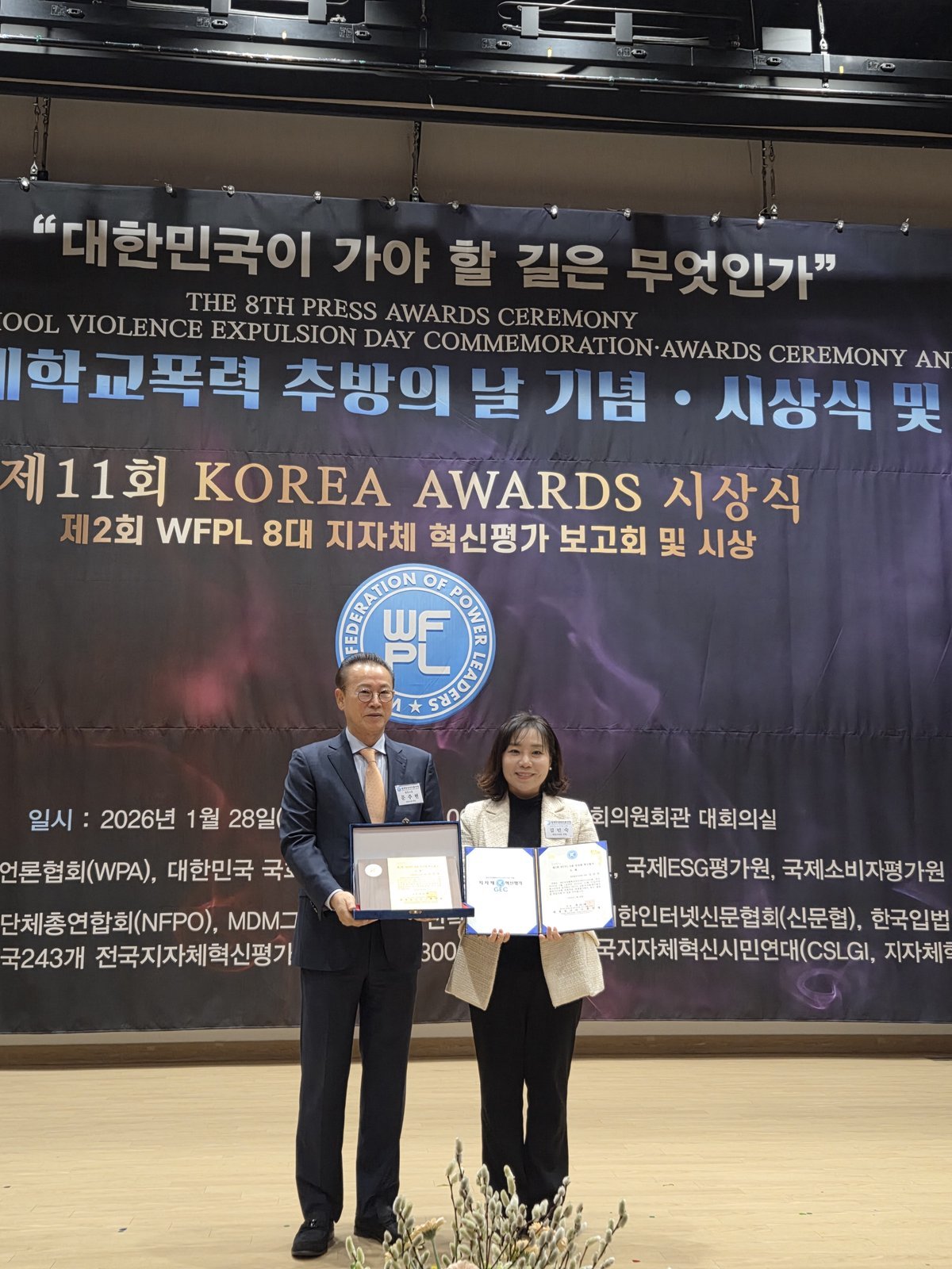 세계청년리더총연맹 부설 지자체 혁신평가위가 2026년 1월 28일 오후 국회의원회관 대회의실에서 대한민국 국회 등과 공동 주최한 제2회 WFPL 8대 지자체 혁신평가에서 김민숙 대전시의원은 최고 평점을 받아 '대상'을 수상했다.