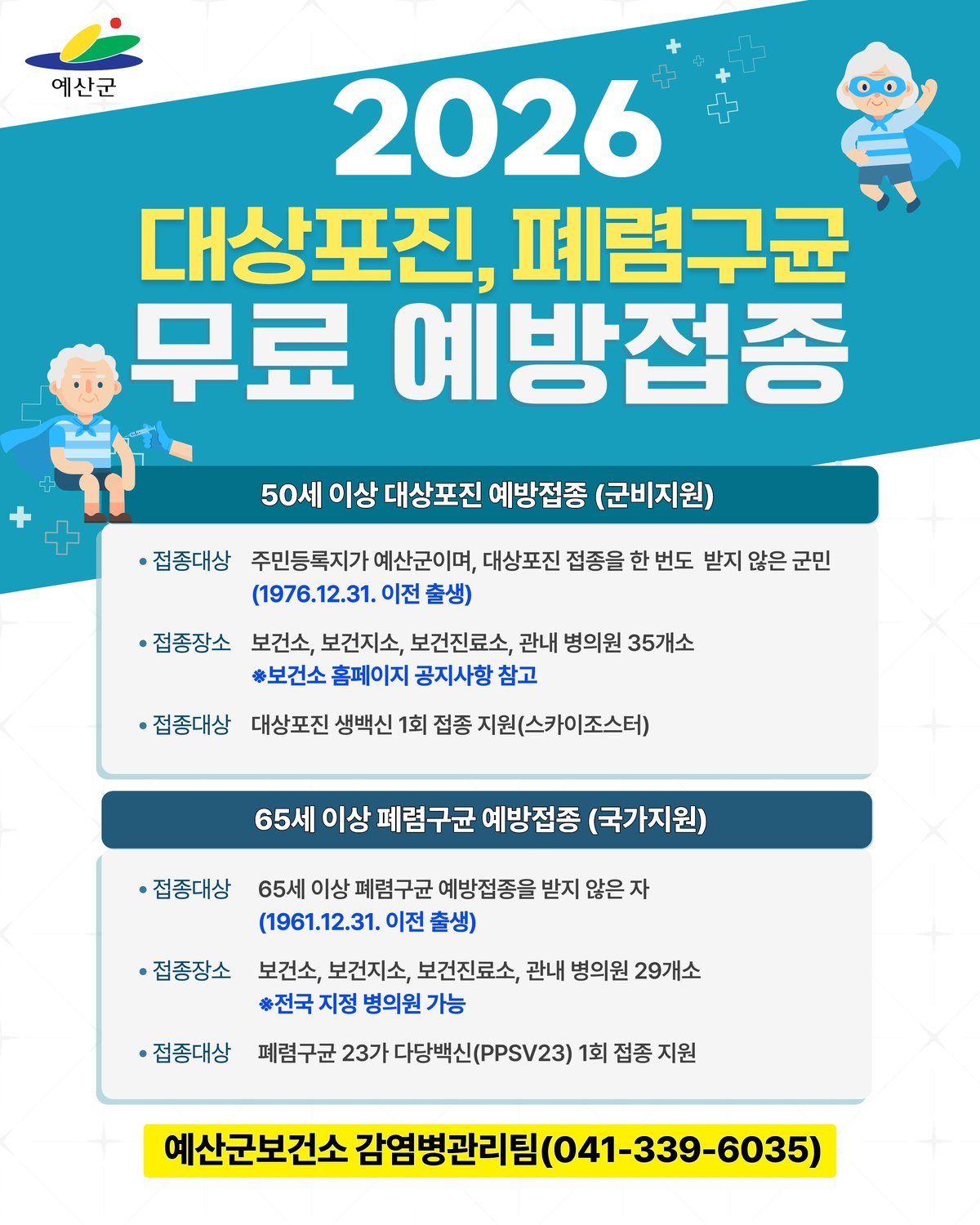 [충청중심뉴스] 예산군은 면역력이 약해지는 중장년층과 어르신들의 건강 보호를 위해 대상포진 및 폐렴구균 무료 예방접종을 연중 실시하며 군민들의 적극적인 참여를 당부했다.