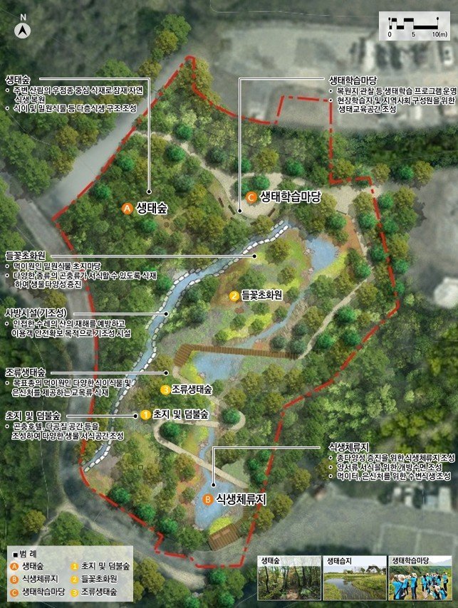주요 시설은 초지 및 덤불숲, 조류생태숲, 들꽃초화원 등이 포함되며 습지 조성과 전망대 등 자연 관찰과 학습이 가능한 공간으로 조성된다.