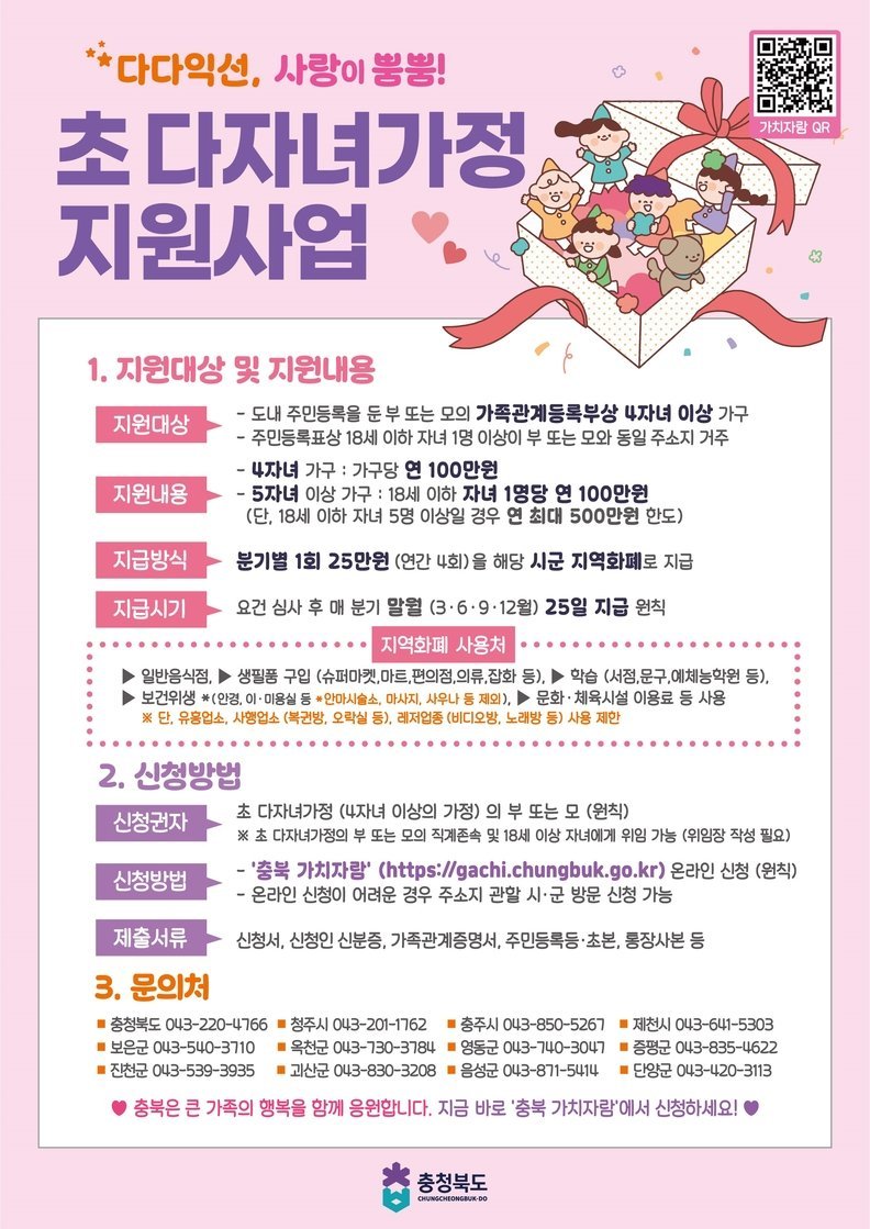 지원 대상은 충주시에 주민등록을 둔 부 또는 모를 기준으로 가족관계등록부상 4자녀 이상 가구로 18세 이하 자녀 1명 이상이 부 또는 모와 동일 주소지에 거주해야 한다.