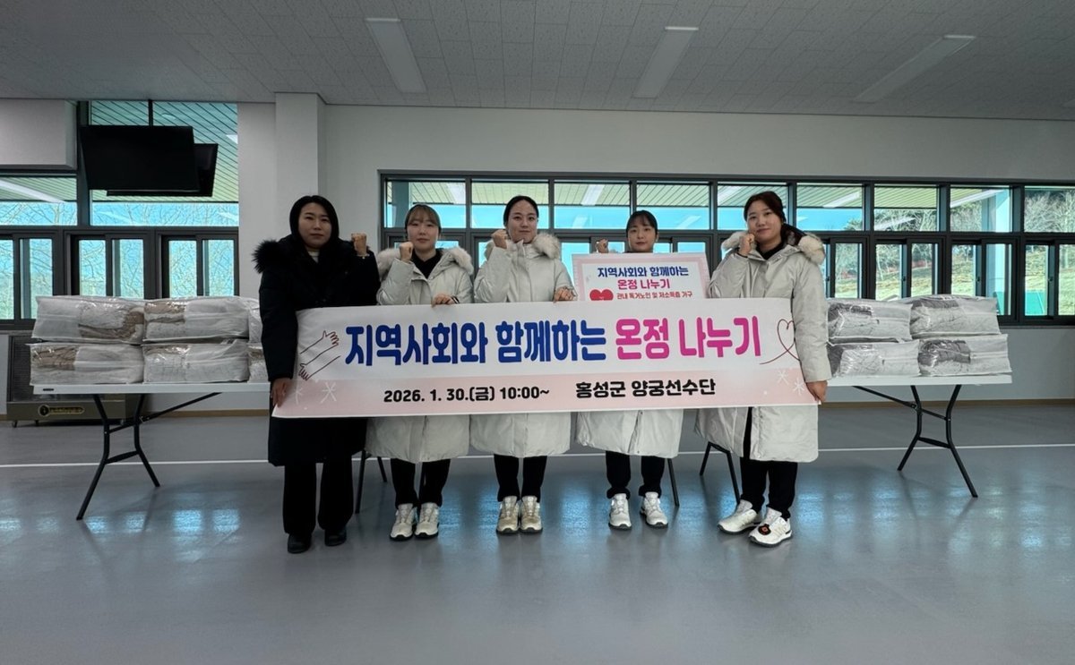 홍성군은 지난 30일 양궁선수단 소속 감독과 선수들이 직접 관내 독거노인 가구를 방문해 겨울철 추위를 이겨낼 방한 물품을 전달했다고 밝혔다.