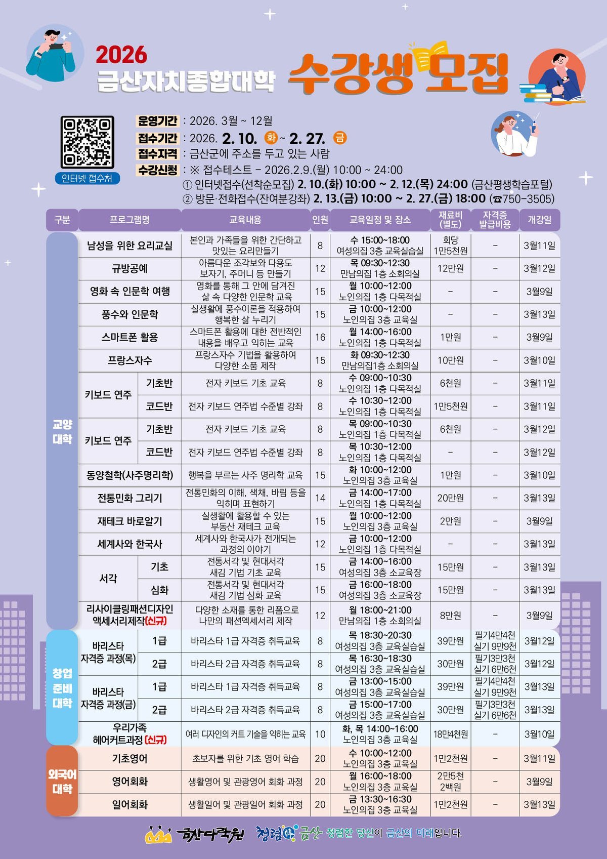 1차 인터넷 신청은 2월 10일 오전 10시부터 12일 밤 12시까지 금산평생학습포털에서 할 수 있으며 이는 선착순으로 진행된다.