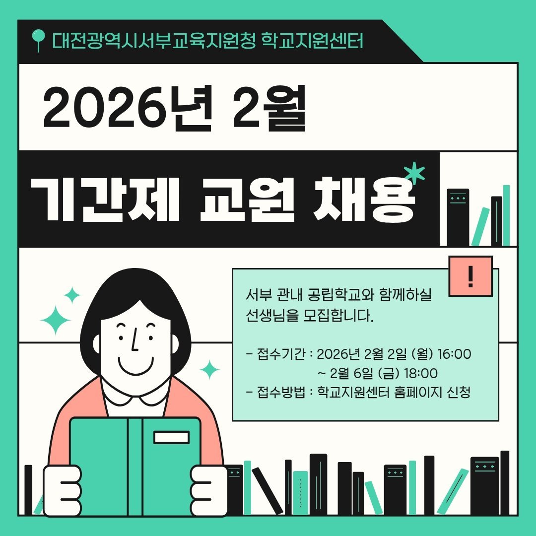 [충청중심뉴스] 대전서부교육지원청 학교지원센터는 학교 현장의 교원 공백 해소와 행정 부담 완화를 위해 ‘2026년도 제1차 관내 공립학교 기간제 교원 공개 채용’을 실시한다고 밝혔다.