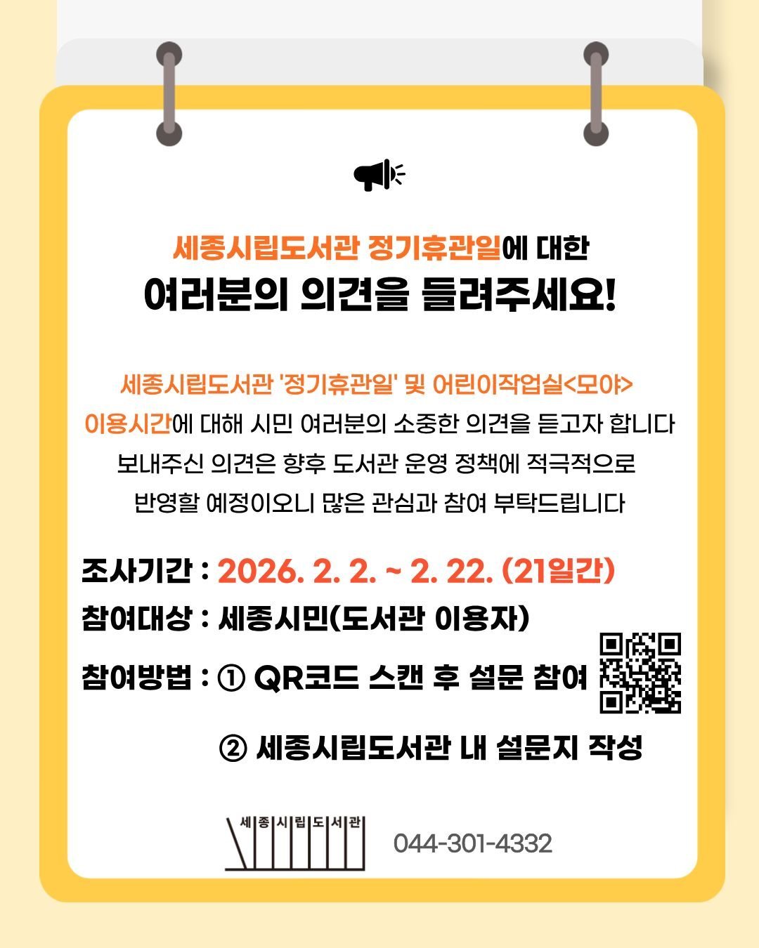 의견 조사는 세종시립도서관 누리집을 통한 온라인 설문과 도서관 내 비치된 설문지 작성을 통해 누구나 참여할 수 있다.