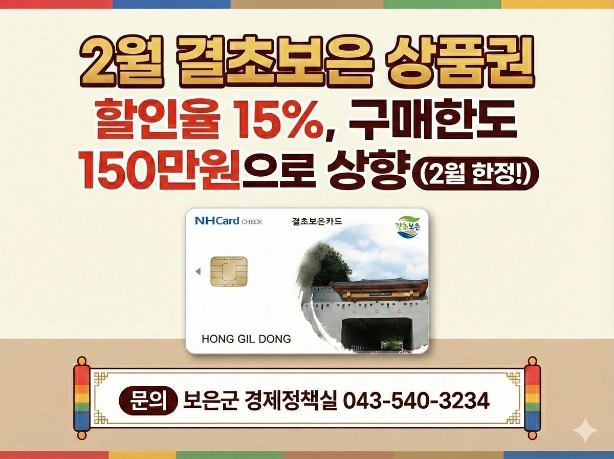 군은 2월 한 달간 카드형 결초보은상품권에 한해 할인율을 기존 10%에서 15%로 상향하고 월 구매한도를 100만원에서 150만원으로 확대해 운영할 계획이다.