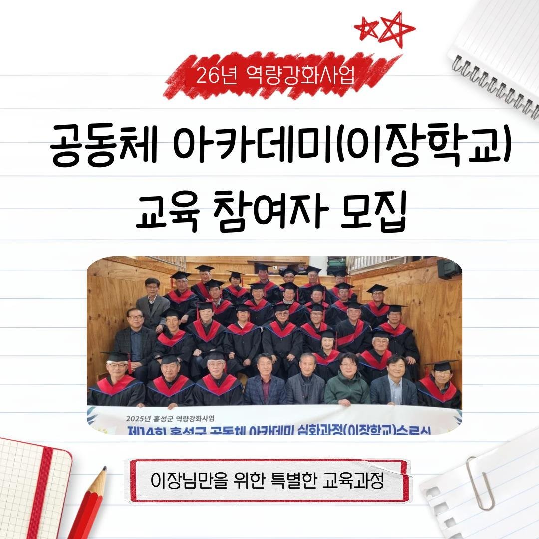 [충청중심뉴스] 홍성군 마을만들기지원센터는 마을 운영과 의사결정의 핵심 주체인 마을리더의 역량 강화를 위해 공동체 아카데미 심화과정 ‘이장학교’참여자를 모집한다.