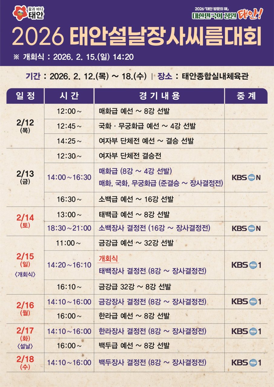 [충청중심뉴스] 태안군이 민족 대명절 설을 맞아 2월 12일부터 18일까지 태안종합실내체육관에서 ‘위더스제약 2026 태안 설날장사 씨름대회 ’를 개최한다.