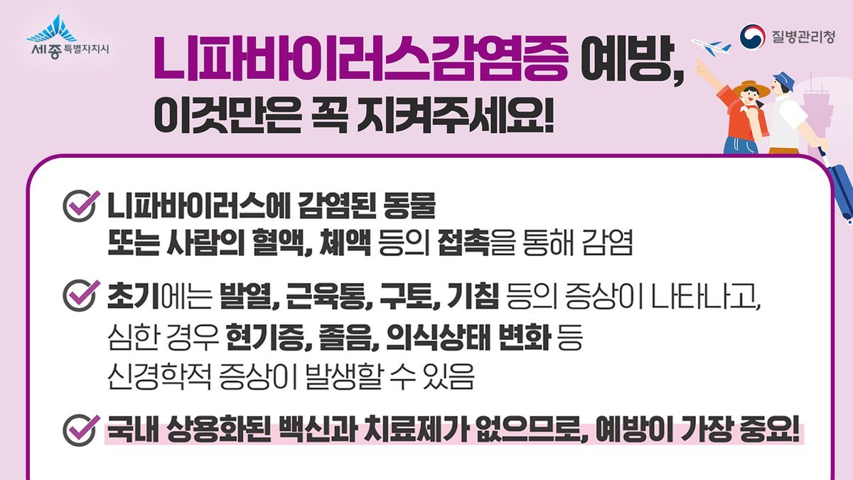 [충청중심뉴스] 세종시가 최근 인도 서벵골주에서 니파바이러스감염증이 유행하면서 해당 국가를 방문하는 시민들에게 각별한 주의를 당부했다.