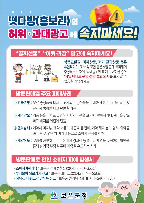[충청중심뉴스] 충북 보은군은 최근 방문판매업 운영과 관련해 노인을 중심으로 한 소비자 피해가 우려됨에 따라, 피해 예방을 위한 종합 대책을 마련하고 본격 추진에 나섰다고 4일 밝혔다.