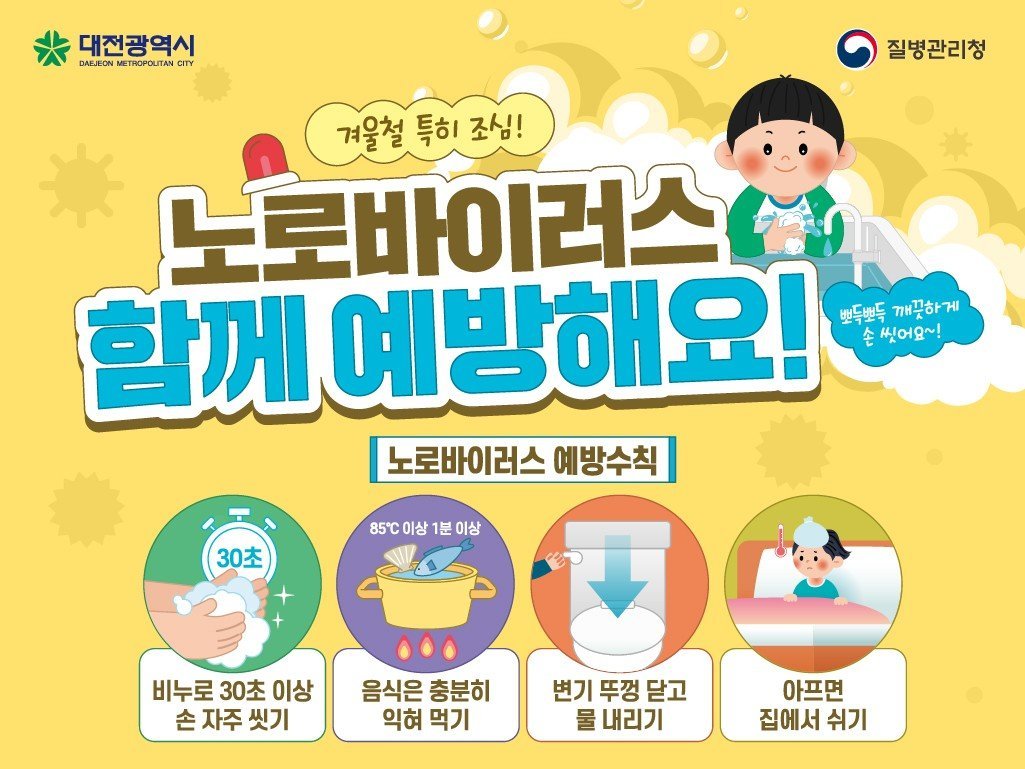 한편 대전시는 설 명절 감염병 예방을 위해 비누로 30초 이상 손 씻기, 음식 충분히 익혀 먹기, 변기 뚜껑을 닫고 물 내리기, 증상이 있을 경우 외출 자제 및 휴식 등 개인위생 수칙 준수를 당부했다.