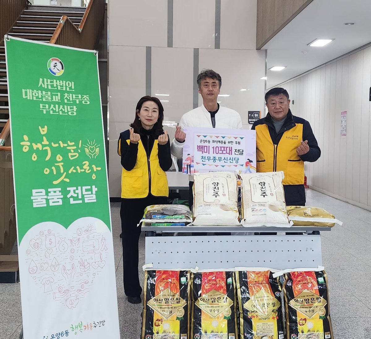 [충청중심뉴스] 사단법인 대한불교 천무종 무신신당은 지난 6일 백미 10kg 10포를 온양6동 행복키움추진단에 전달했다.