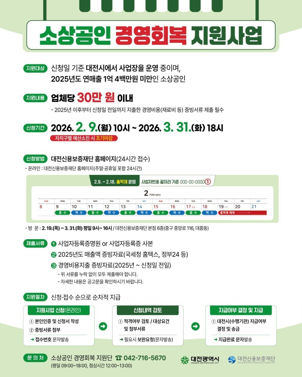 신청 기간은 2월 9일 오전 10시부터 3월 31일 오후 6시까지이며 대전신용보증재단 홈페이지를 통한 온라인 접수로 진행된다.