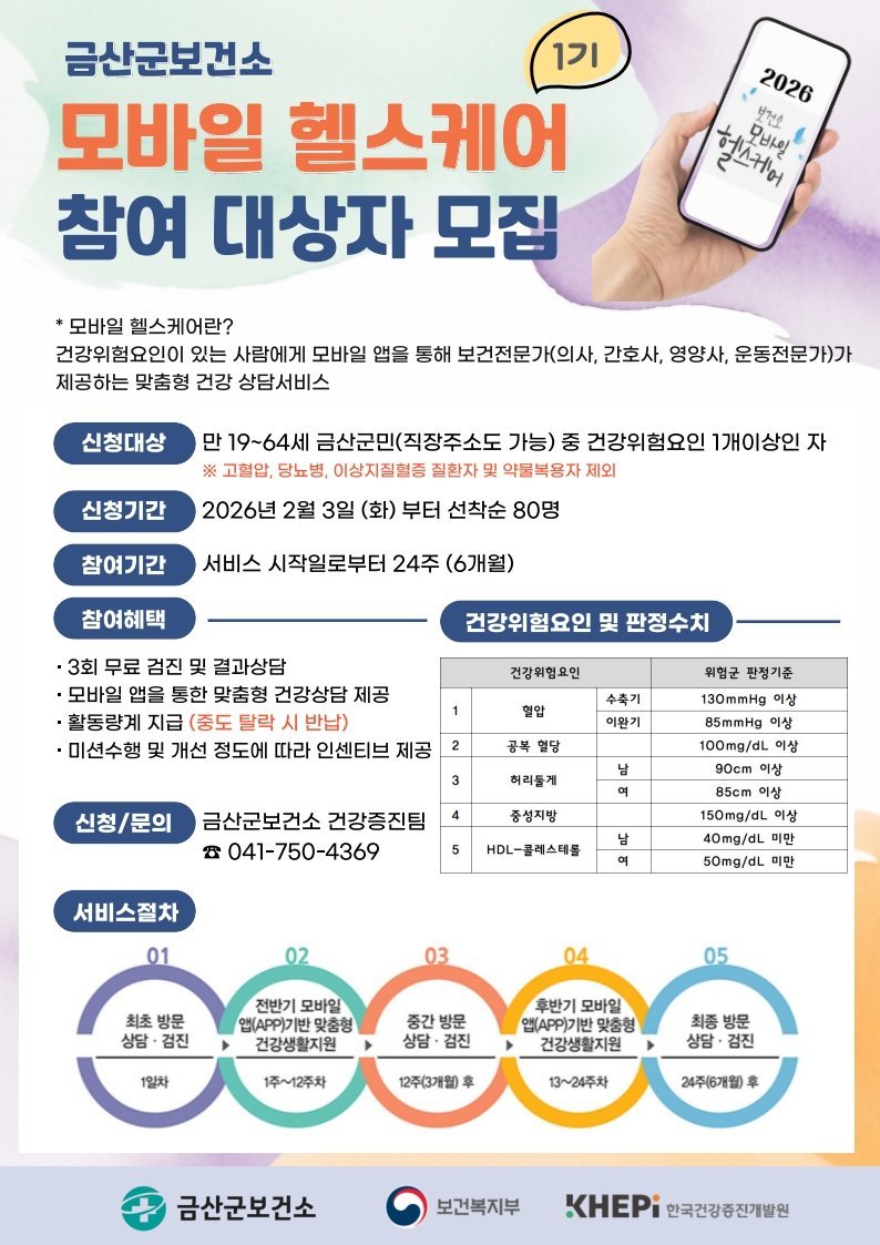 [충청중심뉴스] 금산군보건소는 2월 9일부터 2026년 모바일 헬스케어 1기 대상자 80명을 선착순 모집한다.