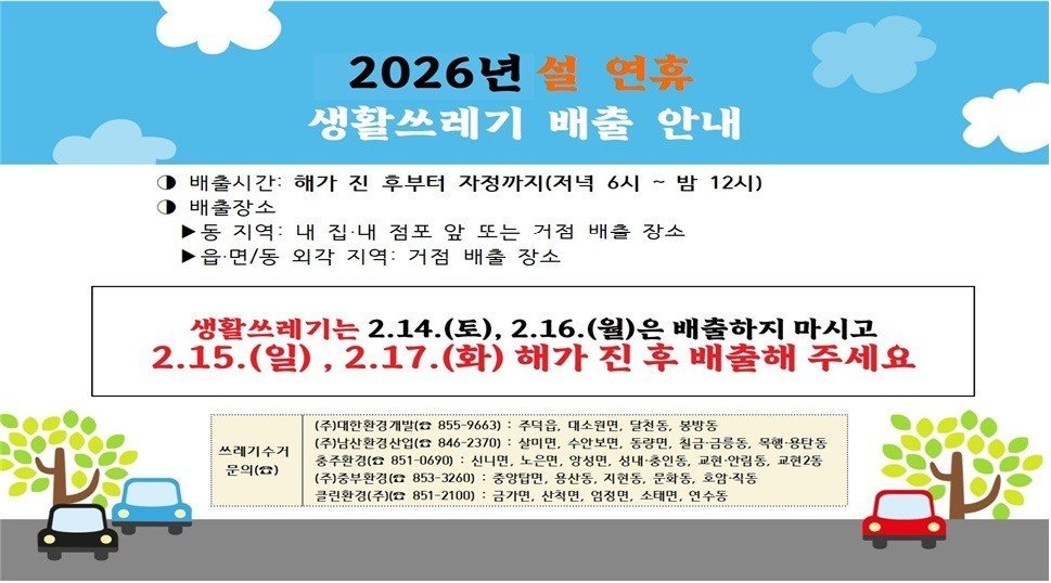 [충청중심뉴스] 충주시는 2026년 설 명절 연휴 동안 쾌적한 도심 환경을 유지하고 시민과 귀성객의 생활 쓰레기 배출 불편을 최소화하기 위해 설 연휴 쓰레기 관리 종합대책을 추진한다고 10일 밝혔다.