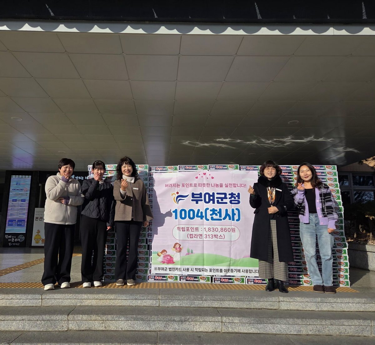 [충청중심뉴스] 부여군은 부여군 법인카드 사용 시 적립된 포인트 183만원을 활용해 관내 저소득 취약계층에 컵라면 313박스를 전달했다고 밝혔다.