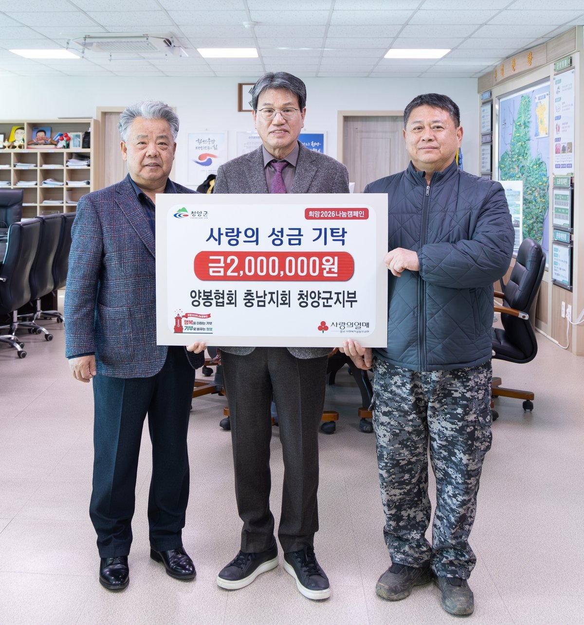 [충청중심뉴스] 청양군은 지난 9일 사단법인 양봉협회 충남지회 청양군지부가 어려운 이웃을 돕기 위한 사랑의 성금 200만원을 기탁했다고 밝혔다.