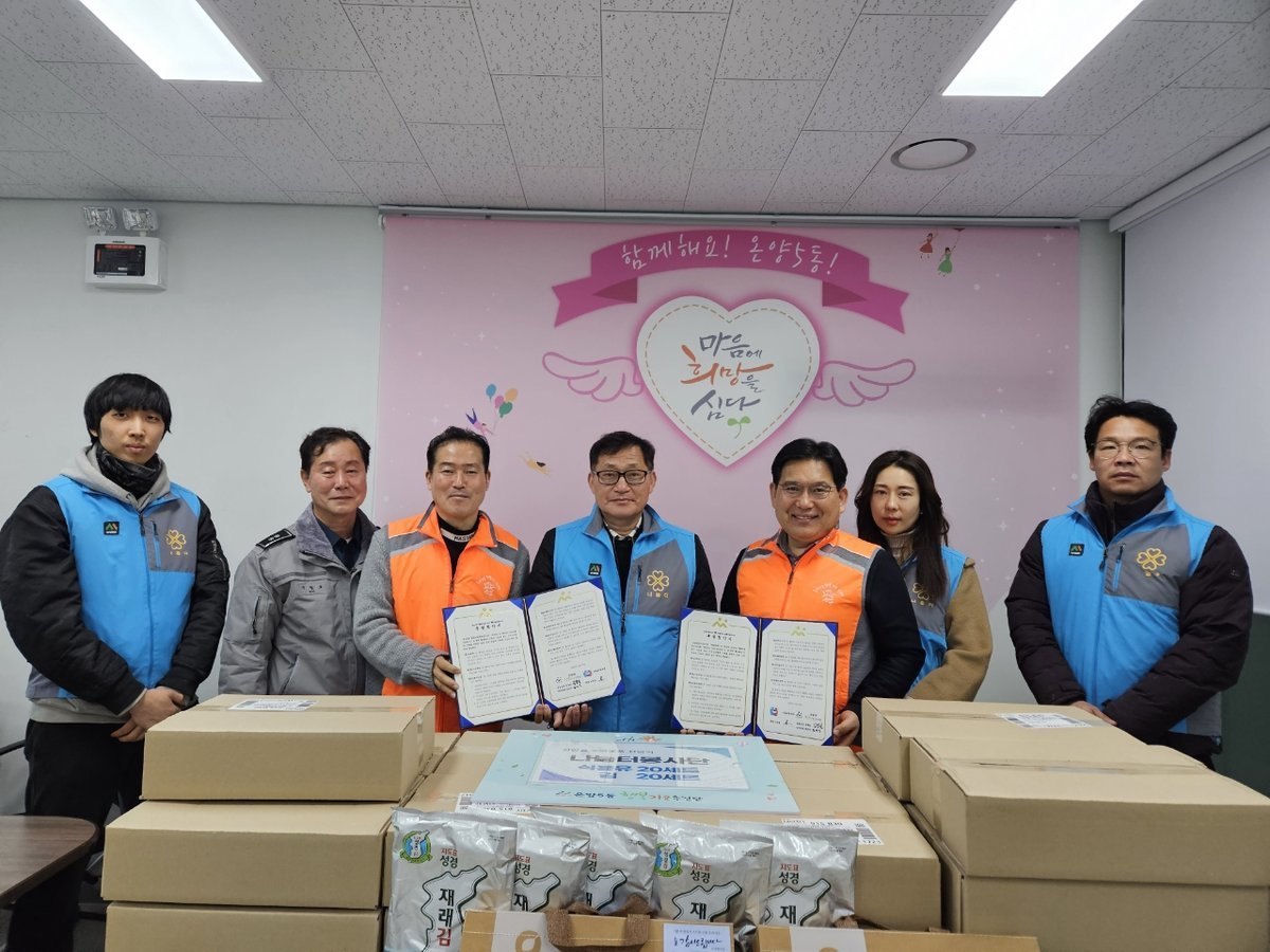 [충청중심뉴스] 나눔터봉사단은 10일 온양5동 행복키움추진단과 지역사회 복지 증진을 위한 업무협약을 체결하고 설 명절을 맞아 후원물품을 전달했다.