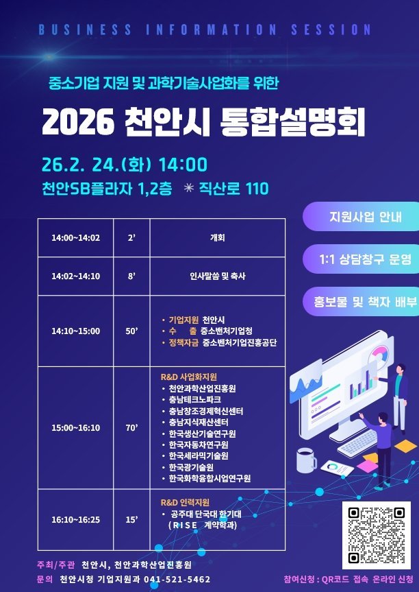 [충청중심뉴스] 천안시는 오는 24일 천안과학산업진흥원과 함께 천안SB플라자에서 ‘중소기업 지원 및 과학기술사업화를 위한 2026 천안시 통합설명회’를 개최한다고 11일 밝혔다.