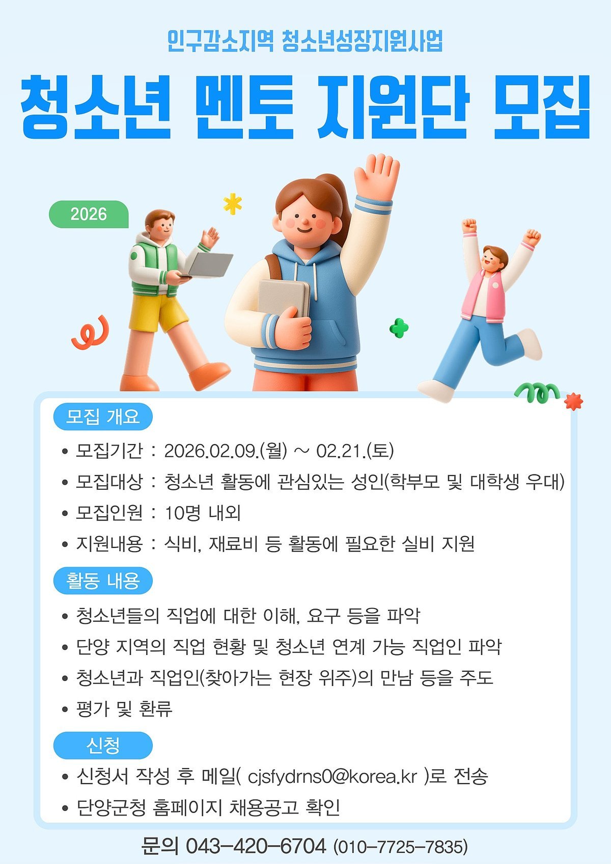 [충청중심뉴스] 단양군청소년수련관은 인구감소지역 청소년성장지원사업의 일환으로 청소년의 건강한 성장과 진로 탐색을 지원하기 위한 ‘청소년멘토지원단’을 모집한다고 밝혔다.