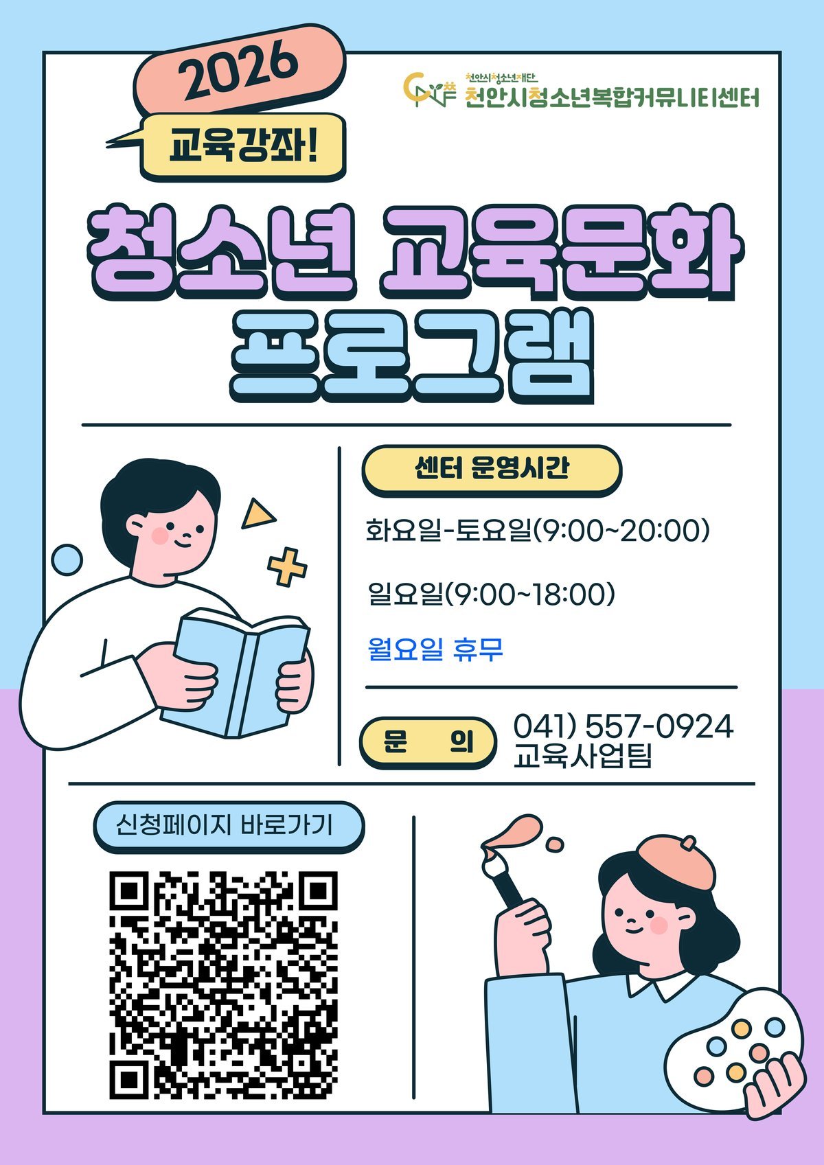[충청중심뉴스] 천안시청소년재단 천안시청소년복합커뮤니티센터가 내달부터 운영되는 ‘2026년 새 학기 교육문화 프로그램’ 수강생을 모집한다고 12일 밝혔다.