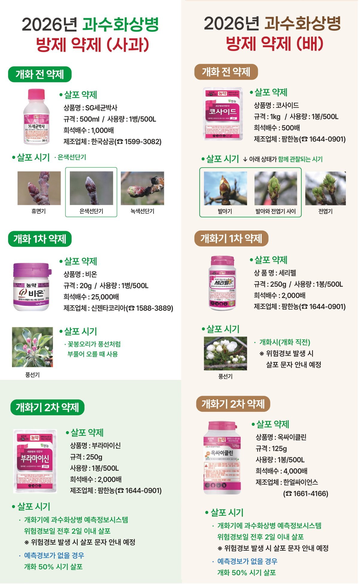 개화 전 방제 시기는 사과의 경우 은색선단기, 배는 발아기 또는 발아기와 전엽기 사이에 살포해야 한다.